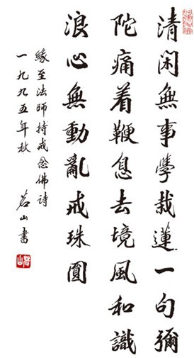 此为四句。第二首,见于2000年5月29日(日记)。这一天他到北京参加赵朴老示寂回向法会。他在日记中记云:"昨在赵朴老灵堂,见有五年前(1996年)自书临终遗偈八句,抄录於此,以为借鉴。(生固欣然,死亦无憾。花落还开,流水不断。魂兮无我,谁欤安息?明月清风,不劳寻觅。)今天,我也想出八句的临终偈,以告慰弟子们: