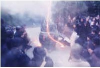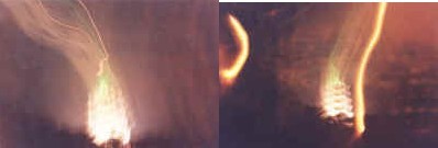 哪知,缸下点火开始,天空突然飞来三颗金色的光圈,众弟子们惊呼起来,有的看似三朵金色莲花,有的看似曼陀罗花,有的看似白鹤、孔雀,有的看似吉祥鸟,有的看似妙音鸟…这时,天现奇迹,降下两道光柱,把山顶的万佛塔照得通明,奇异的是两道光柱并不垂直,而是有孤线的飘落而下,竟与莲花缸前两支点燃了的小小蜡烛相连。有几位弟子已把这珍贵的镜头拍摄下来了。