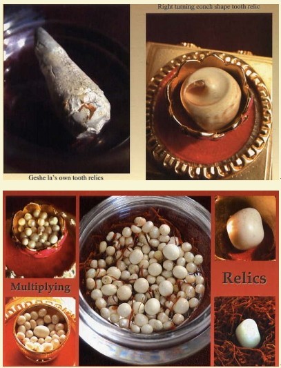 格西的舍利置于柯槃寺格西房内供桌上的容器中,之后,舍利不断地增生。一组两颗舍利增加到三十七颗,另一组增加到二十八颗,遗骨也不断生出珍珠和黄金般的舍利,骨灰中也现出舍利。在舌头上清楚可见一尊自然生起的度母像,并日益明显。心脏则持续缩小,同时生出血舍利。一颗牙齿现出海螺相。依据伦祝喇嘛的开示,舍利代表瑜伽士的圣身,舍利的增加是格西成就力量的迹象。