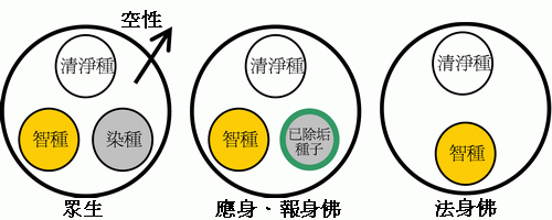 在修行过程中,由于业障渐消除,智慧逐渐增加,在成佛之时,终于破无始无明而复得四智妙功用,即A’→A*(与本具者相同)。到法身佛时,所有识种子垢染消除干净,所有识种子全部转成智种子,即a’→a*,我们为区别此由修行而来的智种子与本具智种子的差别,将修行而来者写成{a’=a*},这就是不空如来藏的智种子,此种子具有可成就佛身与佛土的妙用;但空如来藏的智种子{a*}则不具此妙用,其可生起应化之各种神通。故法身佛的状况可写成{A*a*;a’=a*,N*}。我们可以说,诸佛依{A*a*}(即空智)作事渡生,而以{a’=a*}依本具{A*a*}之记录成就妙色身与净土。