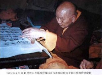 《华严经》是释迦牟尼成道后的第二七日,于菩提树下为文殊、普贤等上位菩萨所说的自内证法门,是如来一代时教中的根本法轮,亦即顿教法门。它记述了佛陀的因行果法,说明了“一多相即”、“四法界”、“六相”、“十玄门”等法界缘起的理论和重重无尽、事事无碍等玄旨,是中国佛教华严宗的立宗经典,亦是五台山为文殊道场的开山圣典。早在北魏时期,五台山就成了我国研习《华严经》的圣地。从北魏的《华严论》主灵辩法师开始,继有隋代修佛光观的解脱禅师、唐代的华严四祖澄观国师、五代常转《华严》的继颙宰相、宋金时讽诵《华严》的苏陀室利、元代的华严菩萨正顺、明代血泥金书《华严经》的憨山德清和清代专业华严的阿王老藏大喇嘛等,都是五台山上颇有建树的华严高僧。寿冶法师继承了五台山上研习《华严经》的传统,又在专心致志地研习《华严》,讽诵《华严》,书写《华严》,弘扬《华严》奥旨。他认为。“念《华严》乃成佛的正因种子。他为了祈求明白《华严》的境界”(伯圆《五台山上一行者》第六《发心刺血写华严》),遂发大乘菩萨的菩提心,而于出关之后的民国二十五年(1936)八月十五日下午,马不停蹄地开始了刺血书写八十卷《华严经》。他以崇佛的坚定信念和不怕死的坚强毅力,用灵巧的剪刀轮流剪破十指的尖端,.又用锋利的剃刀割破舌头的尖端,把宝贵的鲜血流到杯里,再用一根光溜溜的檀木研磨,去掉血里的纤维。如果在夏天,还要把盛血的杯盂放在盛水的碗里养着,才会不致凝结。就这样以血代墨,用玉毫醮着,一笔一划地,一字一段地写着。他每天写千字左右,’一直写到民国二十八年(1939)的冬天。当写完《华严经》的第六十二卷时,他身上的血少了,不象从前那样滴答滴答地能自动流出来了。但他还要用手去挤,用这一点点的血坚持书写。众所周知,血液是在心藏作用下,通过血管流遍全身的一种维持生命的液体。寿冶法师这种超量的出血,就使他面色苍白,浑身焦黄,四肢无力,连拜佛的气力也没有了,得了严重的贫血症。这时,广济茅蓬和碧山寺的僧人、信众,都看在眼里,急在心上,遂请来了大同府的八位名医,会诊配方,大剂量的服药,但也不见好转。然而,寿冶法师还笃信佛菩萨的加被,而每顿饭还可吃斤数面粉,仍然不以为然。如此这般,到民国二十九年(1940)的春天,他还要决心将经写完。因此,于2月21日普贤菩萨的诞辰时,跪倒在方丈室的文殊像前,他祈求菩萨慈悲,愿菩萨成就他把这部《华严经》写完,死也无憾。说也奇怪,他在祈愿顶礼后,神奇的愿力终于战胜了病魔的作怪。他觉得浑身轻松,清凉自在,又精力充沛地恢复了正常的血写经书工作。他一鼓作气地写,写呀,写呀,一直写到同年6月19日时,这部六十万零四十字的《华严经》终于写完了。