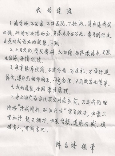 ⒈病重时,不回家,不住医院,不抢救。请勿违我的心愿。此时可安排助念,寿缘未尽亦不死,寿尽则往生。这是对我最好的关怀。至感!