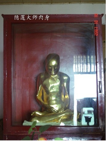(一)2001年4月19日,湖南双峰雷峰山法印比丘尼,从九华山请来师傅,打开了已经圆寂三年零五个多月的隐莲法师的黑漆棺材,开棺后,奇迹出现了,喜见隐莲法师栩栩如生,头发、胡子都又长出来了好几分,并更转青色,触摸身体,肌体还有弹性,在场四众甚为惊叹!当天给法师盘腿,大腿还柔软富有弹性,因为腿盘错了,又给肉身重新盘一次,九华山的师傅叹为观止,他们说在九华山很少看见如此殊胜的肉身菩萨,圆寂后,放在潮湿的山坡中,棺木入一尺接地气,露出二尺接天气,在湖南这样炎热潮湿的环境里面,没有任何防腐的措施,三年半后竟然与生前无异、真是稀有难得的肉身菩萨!