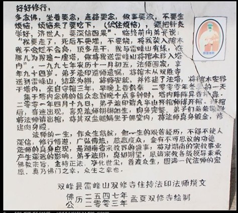 (八)隐莲法师预知自己快临命终,以讲故事的形式向弟子交待后事:“以前,有个老和尚往生了,不用土葬,不用火化,入棺三年,尸体不烂不臭,并能长出胡子头发。”法印当时只当故事听,而未放在心。后来,法师病中又向弟子说:“我要走了,死后,不要埋,不要烧,我已准备好棺木,将我装入棺木,我不会烂不会臭,顶多是干,我与雷峰山有缘,在那儿为我建座塔,你将我送雷峰山将棺木移入塔内。”法印师见此情形,恳请隐莲法师住世,此时弟子才知师父讲故事便是讲自己,深悔自己愚痴。当时法师说世缘已尽,默不作答。几天后,法师再次交待弟子:“我真的要走了”,并且告诉法印雷峰山的情形。雷峰山是法印的故乡,可隐莲法师从来没有去过,怎么会知道得这样详细呢?他告诉法印说自己在打坐时看见的,那里与自己有缘。年轻的时候自己有一个名字叫做“清雷”,确实与雷峰山有缘。