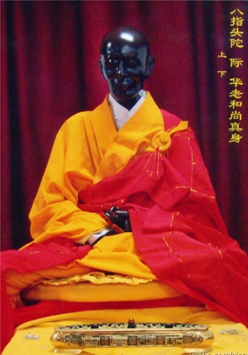 际华老和尚(1910-2005),四川成都人,俗名章际华,24岁舍俗出家,他自24岁出家之后,一直坚持行脚僧,云游四海,从四川、湖南、河北到浙江,29岁在浙江宁波阿育王寺发菩萨心,燃左手无名指供佛,30岁又在阿育王寺燃右手无名指供佛。后又在汶溪寺闭关6年,人称“八指头陀”。他是谛闲老和尚的法子,是法华宗的传人,专修大方广佛华严经,每天背课普贤菩萨行愿品,数十年如一日。