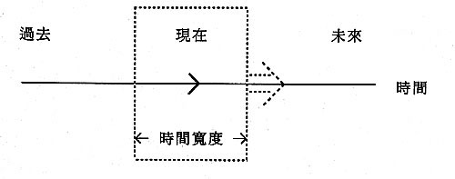 时间从「过去」到「现在」再往「未来」进行,过去的消失了,现在的正存在,未来的尚未发生。「现在」这个时间点应该是有宽度的,纵使宽度非常小,小至10-15秒,仍然是有宽度的。「现在」不停地向未来推进,也带着「时间宽度」向未来推进(如图虚线部份)──在「时间宽度」内都是「现在」,现在的正存在,而不是已消失,也不是尚未发生。同一「时间宽度」内所有发生的事件均持续存在,直至超出现在的「时间宽度」之外进入过去才消失;未来的也因进入现在的「时间宽度」之内而存在。此外,在「现在」这个时间宽度内虽然没有过去和未来,但其中的事件仍然有一个先后秩序,此先后秩序不同于过去和未来,而全是现在,是存在于现在中的先后秩序,也可以说在这个「时间宽度」内的过去不消失,未来的已经来了。「时间宽度」是一个存在的事实,事实当然可以用一个实例来说明。例如我们乘飞机的时候,座位前有一句话: