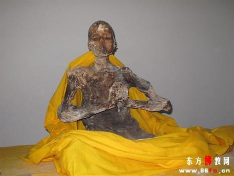 参加法会的中华孔子学会会长助理朱先生仔细观察了肉身状况。他说:“老和尚肉身面带微笑。老和尚的数位出家弟子和在家弟子,用手指弹肉身耳垂及按触手臂肌肤,发现两处皆有弹性。肉身眼皮被翻开,眼睛犹存,清澈如生。肉身跏趺坐,两手结印,手足柔软。”据老和尚在家弟子尹先生介绍,肉身所结手印为内缚印。