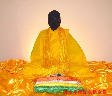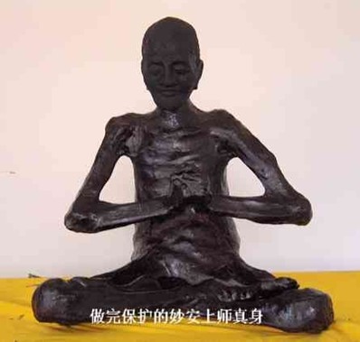 妙安老和尚一生潜修默行,持戒精严,行不倒单。三业清净,六根纯和。广行六度,普利有缘。以言传身教摄受众生。老和尚生前发愿留全身舍利,希望众生见而长善根增正信。圆寂后特以肉身示现,以真实之行显菩提之道。 众弟子依其所嘱将法体入缸封龛,建塔存放,开缸约期三年半。