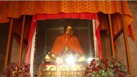 释海庆法师1991年圆寂,住世79年,僧腊61。同修寺僧将其装缸入殓,葬于寺产之地。九七年秋,现任住持海贤师提出:三位同修将遣骨送回祖地入塔。开缸时,发现海庆师端坐如初,肌肤红润,富有弹性,将其合十双手分开仍回复原状;除念珠串线已腐断外,眉、发、僧衣及随身经书等完好无损。出土三年来,弹性已不如当初,红润色已渐变为铁黑紫色,由於多人触摸移动,形体稍有改变,口形微张,须发似有长长,实为一罕见之肉身菩萨金钢不坏体。