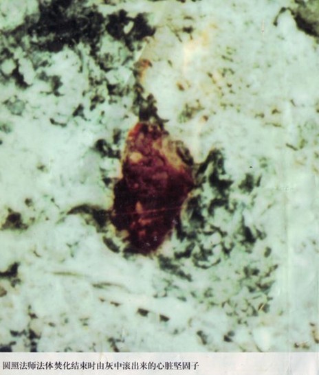 四天之后,众弟子按照佛教教规,在寺内一大青石板上架起木樵,将法师法体焚化。大火烧了整整一天一夜,法师遗体具已成灰,唯有牙齿等晶莹如玉,完好无损,形成舍利子。另有100多颗大小不一、形状各异的舍利子和舍利花。舍利花颜色雪白,在海绵状的空隙内,镶嵌着米粒大小呈红、黄、蓝、褐等颜色的结晶体。尤为神奇的是,法师的心脏久焚不化,形成一个呈黑褐色的巨大坚固子,火化刚结束时心脏尚软,遂逐渐变硬。当时在场的百余名僧俗弟子均亲眼目睹这一惊人场面。