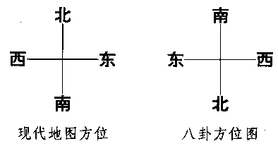 八卦的图案,乾卦代表天在上,坤卦代表地在下,画出来就是前面伏羲的先天图,它的方位,和现代我们所用地图,上为北方、下为南方的情形,恰恰相反。八卦的方位,上面是南方,下面则是北方,它的图是这样的: