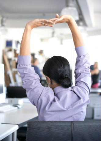 坐着时,建议保持正确的姿势:背部挺直,肩膀自然下垂,肘部放松,置于身体两侧。整形外科医生伊恩·哈丁指出,臀部应该能接触到椅背,少跷二郎腿。键盘要在你的正前方,鼠标在键盘一侧,电话不要离人太远,最好一伸手就能够到。在使用键盘鼠标时,尽可能保持手腕平直,肩部放松。