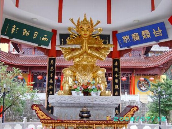 很久以前,韦驮菩萨化身行脚僧自九华山下来,途经龙飞凤舞、狮蹲象踞的天目山,顿时萌生在天目山结庐之念。没隔多久,这位特殊的“行脚僧”便在天目山募建了一座伽蓝。有一天,他同时在杭州、富阳、昌化等地出现,祈请各处高僧大德及善信于六月初三即韦驮菩萨圣诞之日光临天目山,届时将举行开坛升座的大法会。是日一早,钟鼓齐鸣,幢幡高悬,祥云绕殿。诸山大德、十方善信如约前来,座坛大法会也如期举行。法事圆满后,四众都缓缓散去。就在此时,座坛法师即那位"行脚僧"却突然失踪了!众人四处寻找,均不见其踪影。至晚,佛前灯点亮后,众人发现神坛上多出一尊菩萨。只见这尊菩萨全副戎装、手执宝杵、威武端庄地坐在那里。这就是韦驮菩萨的坐像!自此,天目山便被认为是韦驮菩萨显圣度众之应化道场,且屡显灵异,护佑一方。例如,梁昭明太子隐居天目山期间,因把金刚经分成了32品,恶报现前,双目失明,后忏悔感韦驮菩萨显灵,指引其取石池水洗而复明。如,宋末元初的临济宗大德高峰禅师,为了降伏睡魔,毅然置生死于度外,特意站到倒挂莲花峰之峭壁上参禅,先后两次坠崖,均得韦驮菩萨现身相救,毫发无损。又如,清光绪十五年,以韦驮菩萨祷雨灵应,德宗帝御赐“福佑潜城”额悬于寺中。