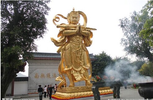 注:佛门中有人认为现在大家把韦陀菩萨和韦天将溷为一谈了,末学认为,未必尽然,韦将军童真梵行。不受天欲,若能在天上又不迷醉天欲,若非菩萨化现,谁能够做到呢?汉地早晚课颂都是成道的祖师编的,每天都念:韦驮天将,菩萨化身,拥护佛法誓弘深。宝杵镇魔军,功德难伦,祈祷副群心。南无普眼菩萨摩诃萨,摩诃般若菠萝蜜。 岂虚然哉,菩萨应以何身得度即现何身而教化,应以天大将军身得度即现天大将军身而为说法。可以说是非一非二吧!