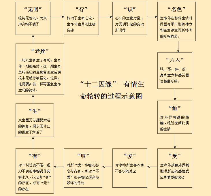 以上就是十二缘起法的简单说明。这是一个非常大的题目,在《阿毗达摩俱舍论》和《阿毗达摩俱舍论本颂》里有极为详细的讨论,我向你们解说的只是最基础的部分。
