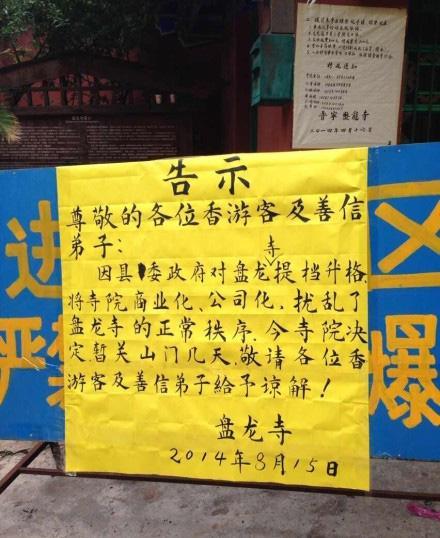 盘龙寺闭门谢客以示抗议的公告,写得简约而强硬:“因县委政府及镇政府对盘龙寺提档升格,要将盘龙寺商业化、公司化,扰乱了盘龙寺的正常秩序,今寺院决定——暂关山门,闭门清修!”