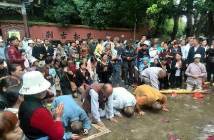 僧众当众叩拜“晋宁县盘龙寺管理委员会”招牌,令人心酸。(图片来源:兰若山居微博)