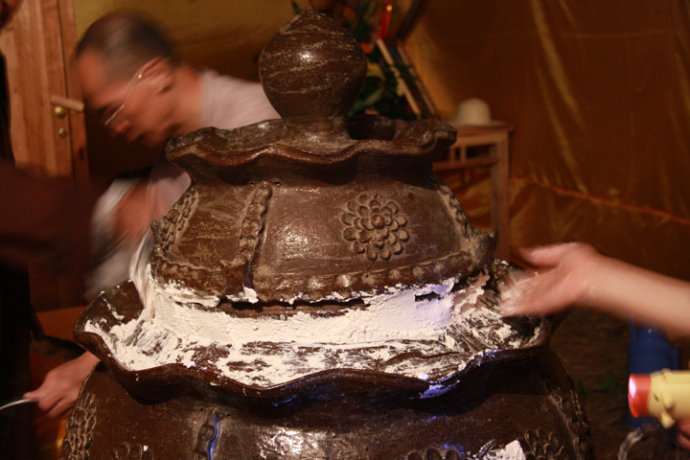 老和尚2008年5月29日22时30分入缸,2011年10月16日22时30分,我们检视到老和尚已然圆满成就,坐缸过程历时约三年半。当年,师兄弟们一意坚守孝道,完成老和尚遗愿而竭力安排坐缸。至于是否能成功,心里没底,也不作任何期待,未来,即便火化,我们也无怨无悔。