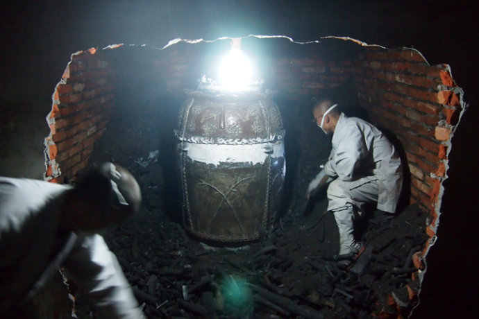 清开大量塔体中的积土与木炭,将缸体从塔中清出。(图片来源:明贤法师)