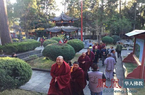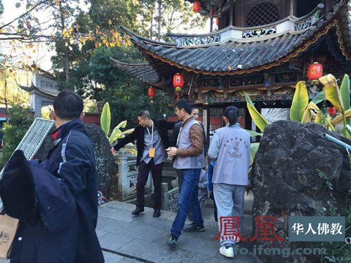 本次研讨会的主会场“祝圣寺”是虚云老和尚为复兴鸡足山所重整的第一座十方丛林。祝圣寺内有近一人高的“云移石”,相传当年修建祝圣寺开挖放生池时见此石不可动,虚云老和尚便发功将此石移到现在这个位置。(图片来源:凤凰佛教 摄影:天成)