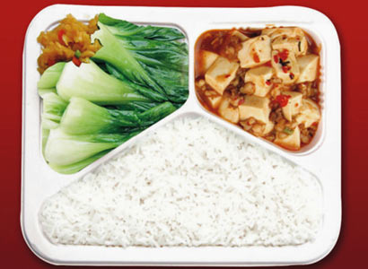 温董、刘先生、我及LD一行四人,点了四份商务套餐。我们的三份,有荤有素;温董的那份,还真是全素。
