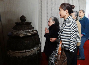 林佳楣女士一行抵寺后,最先来到供奉弥光老和尚金刚法体的大殿恭敬参礼。年届九十高龄的林女士亲为敬香,瞻礼跪拜。随后老人在常住法师们的陪同下来到金刚塔院,在弥光老和尚三年前坐缸所使用的缸体前,老人伫立良久。