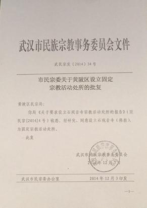 武汉市民宗委关于同意设立石观音寺(佛教)为固定宗教活动处所的批复(图片来源:凤凰佛教)