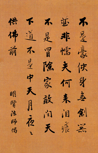 “我等僧徒,因披了这一领方袍,禁止我不到政府与人争权,禁止我不到社会与人夺利,免堕与万劫不拔之深坑;佛教不随流入海,而教人返流归源,是真进化——是以佛教在人欲横流中作砥柱,而为人民谋幸福也。”(明贤写于2014与2015辞旧迎新之际)