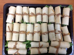5、将浸入味的豆腐皮沥干水,然后一块豆腐皮上铺一块紫菜,再放上黄瓜、冬菇、红萝卜、香菜,卷紧,用一些干的生粉沾在边上,再用黄花菜扎着,就成一个腐皮卷了。