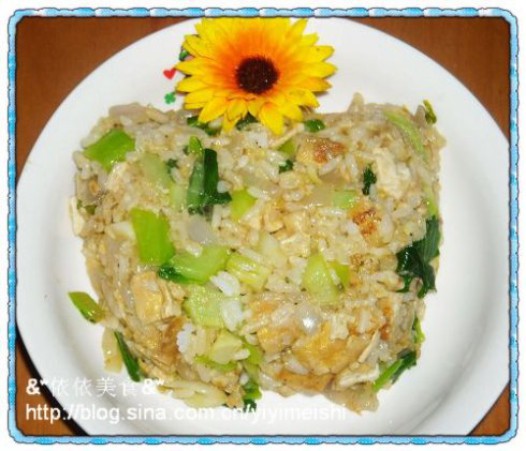 4.重新热油锅,倒进裹上蛋液的饭,中火快速炒,因为包裹了蛋液,一定要快手炒才可以把米饭炒散,然后加入炒好的洋葱、豆腐干、小白菜一起翻炒,加入蚝油炒匀,可以装碟啦