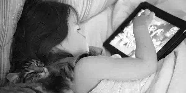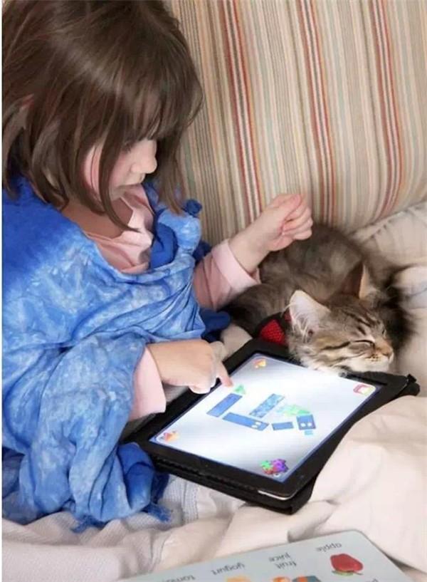 她虽然一只手在iPad上玩游戏,一只手却落在小猫身上。