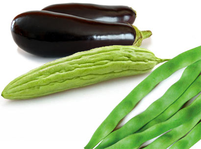 将茄子切成条状放入油中炸至金黄色捞出备用,苦瓜切成条状、豆角切成段,原材料分别飞水,另起锅放入少许油加入姜末煽出香味加入原材料煽炒加入调味料加少许水,稍煮一下勾少许芡汁淋上香油出锅装盘既可。