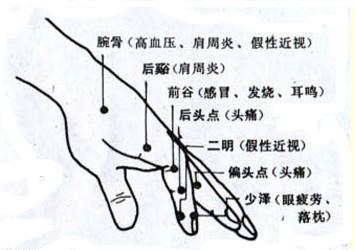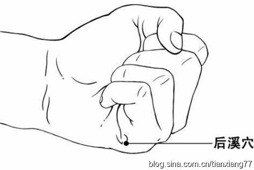 这一系列问题,出于同一原因,那么,通过一个穴,也就可以全部解决,这个穴就是后溪。这是小肠经上的一个穴,把手握拳,掌指关节后横纹的尽头就是该穴。这个穴是奇经八脉的交会穴,通督脉,能泻心火、壮阳气,调颈椎,利眼目,正脊柱。临床上,颈椎出问题了,腰椎出问题了,眼睛出问题了,都要用到这个穴,效果非常明显。它可以调整长期伏案或在电脑前学习和工作对身体带来的一切不利影响,只要坚持,百用百灵。