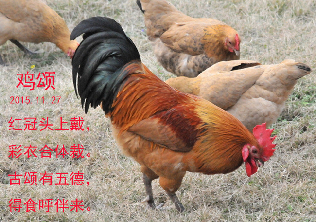 《韩诗外传》说“鸡有五德”:其一曰“见食相呼,仁也。”自古相传“人为财死,鸟为食亡。”如当今社会为财而死者比比皆是。唯有鸡“见食相呼”,呼朋邀友,分享食物,乐此不彼,绝不强抢豪夺,为食而亡,此真乃大仁也。孔子曰“知者乐,仁者寿。”明朝吕坤《呻吟语》说:“仁者寿,生理完也。”即“仁者”在形、神诸方面都完全具备了利于他人和自己生命延续的积极因素。“仁者寿”在儒家养生思想中有着最为集中的体现。这是由于儒家特别注重个人道德修养在养生中的作用,尤其主张个人养德的主动性,来达到道德自我完善的境界,并认为这是人们得以健康长寿的基本要素。仁者寿的原因,儒家有“天佑说”、“情志说”等,以后者的看法较为科学。现代身心医学理论认为,人是大脑皮层统率的完善生物体,因此心理因素对人的健康有着极其重要的作用。道德感是人的社会性的高级情感,自我道德感的满足,能缓解各方面的情感矛盾,能减少心理冲突,并能通过大脑皮层给生理机制带来良性影响,从而有益于健康与长寿。