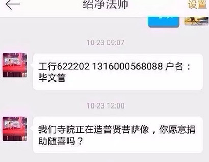 2013年2月,刚刚学佛的王先生突然被一个叫“释绍净”的法师给关注了,并和王先生聊了几句,该法师随即就发了一条让他做功德给白衣寺建寺院的信息,王先生一看是建寺院的,该法师头像又是出家人,非常虔诚地向其帐号打了600元,但是刚打款没几天,发现该法师又给他发了同一条讯息,还是做功德建寺院的。