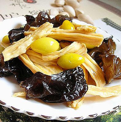 1、黑木耳、腐竹放入水中泡软,白果去壳和皮,放在热水中泡一会儿。