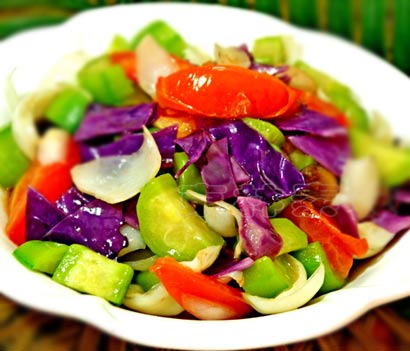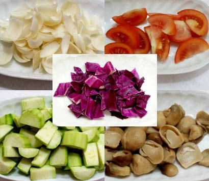 原料:紫甘蓝、丝瓜、百合、草菇、番茄