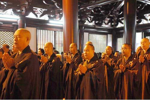 与禅宗“打禅七”不同,净土宗的“打佛七”却是热热闹闹的。念佛堂内,由主七师指导,维那师指挥唱念,从早晨一直到子夜,昼夜不停,参加的善男信女们在引磬、木鱼的引导下,持名念佛,“南无阿弥陀佛”,一声接一声,连成一片。