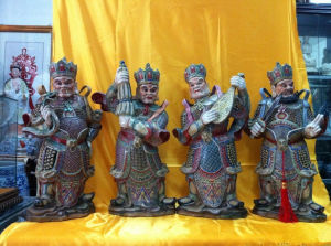 四大天王手上都拿著道具,这些道具也是表法。东方天王手上拿的是琵琶乐器,代表凡是做事情不可以操之过急。就像弹琴一样,琴的弦松了,弹不了,紧了,就断了。这是告诉我们做事情要合乎中道,不能超之过急。我们负责尽职,要做到恰到好处,不要做太过头了,也不能做不及,这样就非常圆满。南方天王,代表日新又新,代表增长。手上拿的是剑,这个剑叫慧剑,慧剑断烦恼。西方天王身上缠著一条龙,龙代表变化,代表这个世界上的一切人、一切事、一切物,变化无常、变化多端。我们要通通把它们看清楚了,才能够应付。北方天王手上拿一把伞,伞是遮盖用的,千变万化的世界,有种种的污染,伞是用来遮盖,要防止不被污染。它代表我们在广学多闻中,要注意保护自己的清净心。