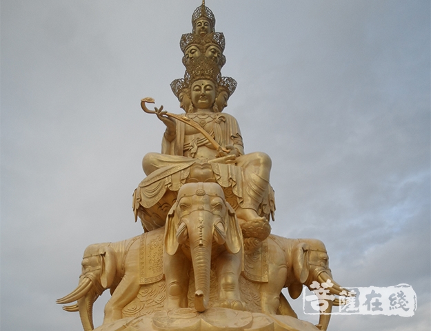 普贤菩萨头戴五佛冠,全身金色,右手执如意,左手结施愿印,结跏趺坐于一头白象身上,随缘应化,足迹遍及法界。经历重重劫难后的他,深切发起大菩提心,身体力行十大行愿,普度众生,最终得以具备各种功德,修成正果。“普贤”一词正是他自身无量功德的最好体现。