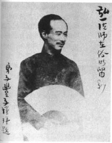 他从来不骂人,从来不责备人,态度谦恭,同出家后完全一样;然而个个学生真心的怕他,真心的学习他,真心的崇拜他。我便是其中之一人。因为就人格讲,他的当教师不为名利,为当教师而当教师,用全副精力去当教师。就学问讲,他博学多能,其国文比国文先生更高,其英文比英文先生的更高,其历史比历史先生更高,其常识比博物先生更富,又是书法金石的专家,中国话剧的鼻祖。他不是只能教图画音乐。夏丏尊先生曾经说:"李先生的教师,是有后光的。"像佛菩萨那样有后光,怎不教人崇敬呢?而我有崇敬他,更甚于他人。