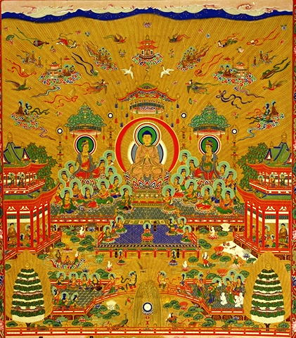 “阿弥陀经变相”的上半部分描绘的是庄严净妙的阿弥陀佛极乐净土世界。