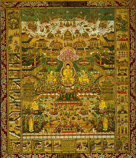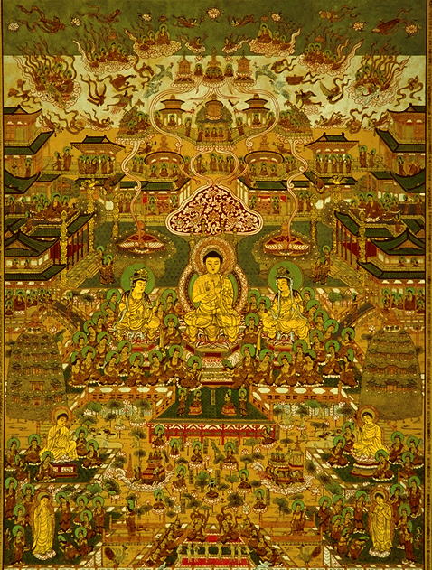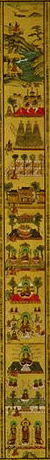 在净土三部经曼陀罗中,"当麻曼陀罗"不仅最古老,影响也最大。本篇中介绍的"独湛曼陀罗"("当麻曼陀罗"独湛禅师摹本)是豪尔德先生于三十年前从日本京都购入的。此图用极其细腻的手法将《观无量寿佛经》的要义和唐代善导大师《观无量寿佛经疏》(简称《观经四帖疏》)的内容巧妙地再现了出来,亲瞻此图的净土行者无不称叹。