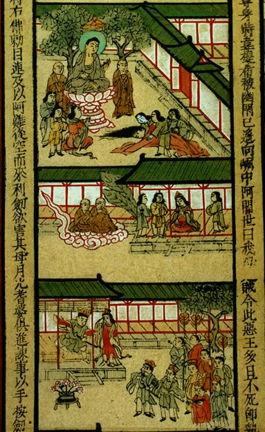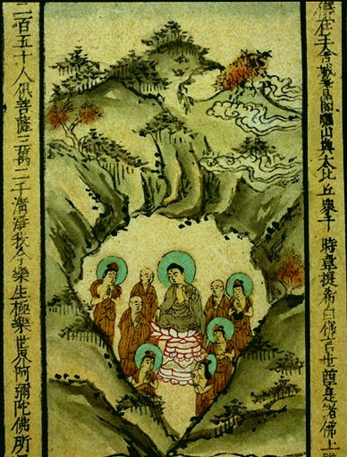 ![]() Enraged, Ajatashatru threatened to kill Vaidehi, but was stopped by the ministers. At Vaidehi,'s request, the Buddha's disciples appeared and then the Buddha himself. She prostrated herself before him. |