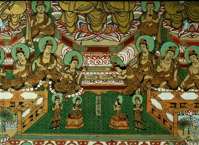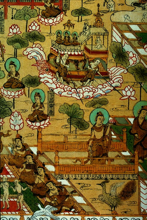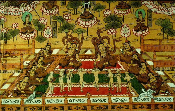 ![]() Those newly born, joined by bodhisattvas, offering dance and music to the Buddha. |
