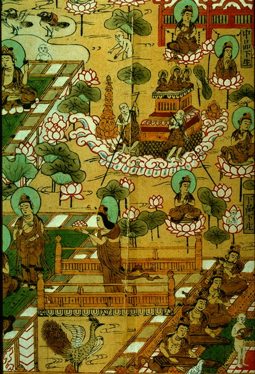 ![]() Two aspirants of the highest level of the highest grade welcomed by Amida and many bodhisattvas. |