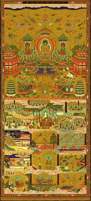 (3)阿弥陀経変相 阿弥陀経の内容を絹地に極彩色と純金を使って表している。1867年の彩色と箱書きにある。他に例を見ない逸品である。128x58cm。 [解説]