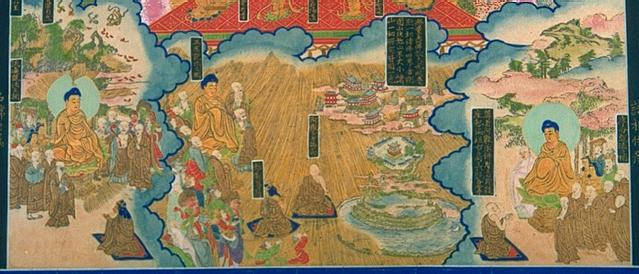(2) 法藏出家:向上一图描绘过去久远无量不可思议劫有五十三佛相继出世,在其后的世自在王如来教化的时代,有一国王舍弃王位出家,名为“法藏”比丘。经云:时有国王闻佛说法心怀悦豫,寻发无上正真道意,弃国捐王行作沙门,号曰法藏,高才勇哲,与世超异[41]。详见《无量寿经》第5段。