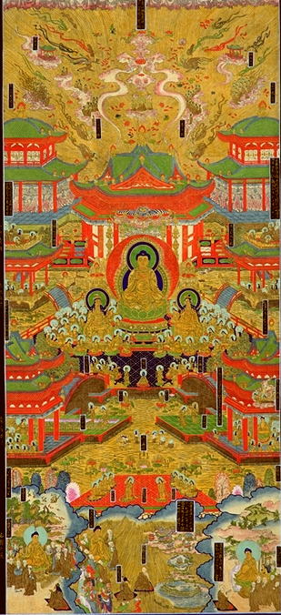 (16)(17)宝楼宫殿:在弥陀三尊身后左右两侧,众宝装饰的宫殿楼阁表现极乐世界的庄严自在。经云:无量寿国其诸天人,所居舍宅宫殿楼阁,称其形色高下大小,或一宝、二宝乃至无量众宝,随意所欲,应念即至。详见《无量寿经》第20段。