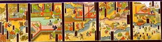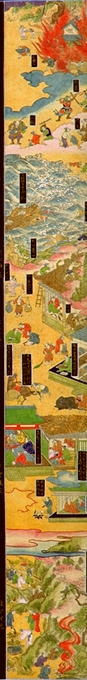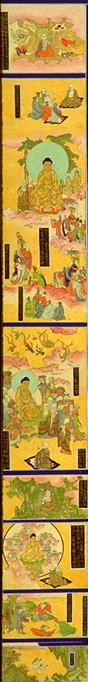 曼陀罗左侧纵向有七幅小图,按从下至上的顺序,描绘法藏比丘的愿行。